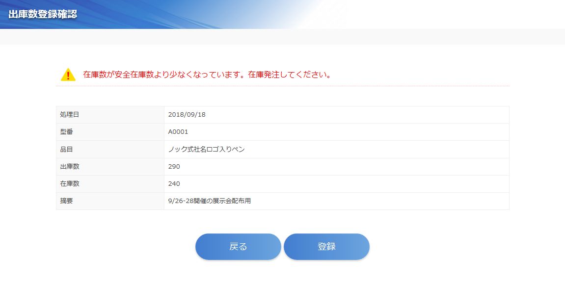 品目ごとの発注点として、安全在庫数を登録しておくことができます。在庫数が安全在庫数を下回ると、発注を促すメッセージが表示されますので、うっかりミスによる在庫切れを防止することができます。
