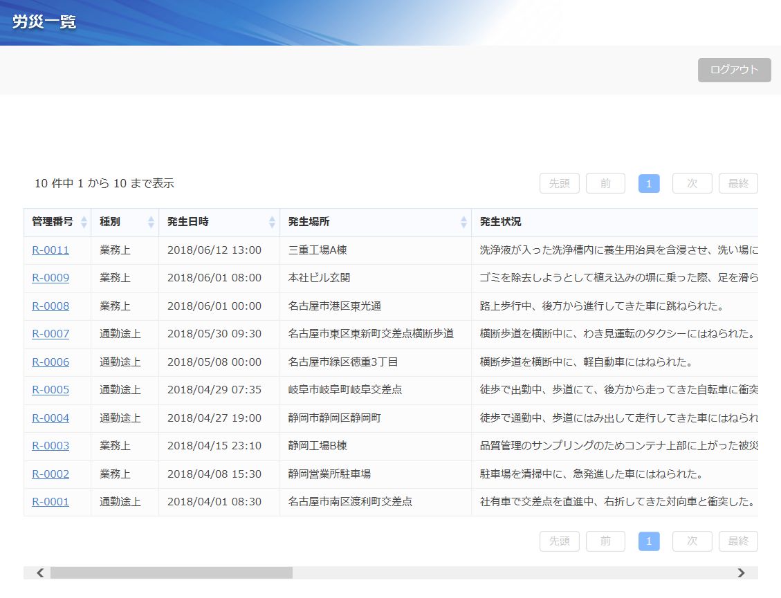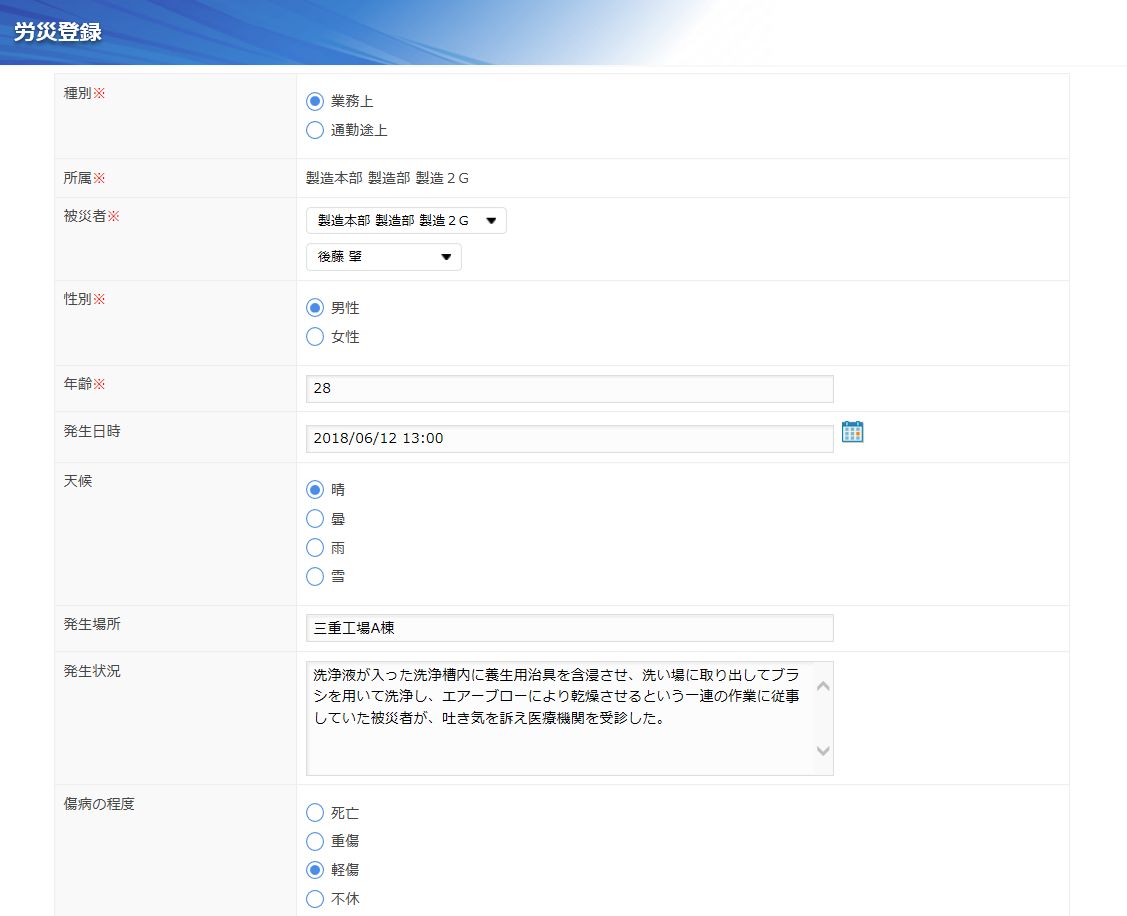 業務上もしくは通勤途上における事故や被災等の、いわゆる労働災害に関する情報を管理するアプリです。
