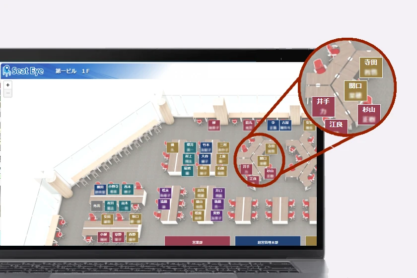 フロア内に滞在している社員の名前がSeat Eye上の座席位置に表示されます。どの社員がどの座席についているのか視覚的に簡単に探すことができます!