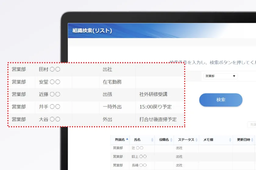 検索リストから登録メンバーの出社、離業、一時外出や在宅勤務、出張などの行動予定のステータスが一覧で確認することできます!